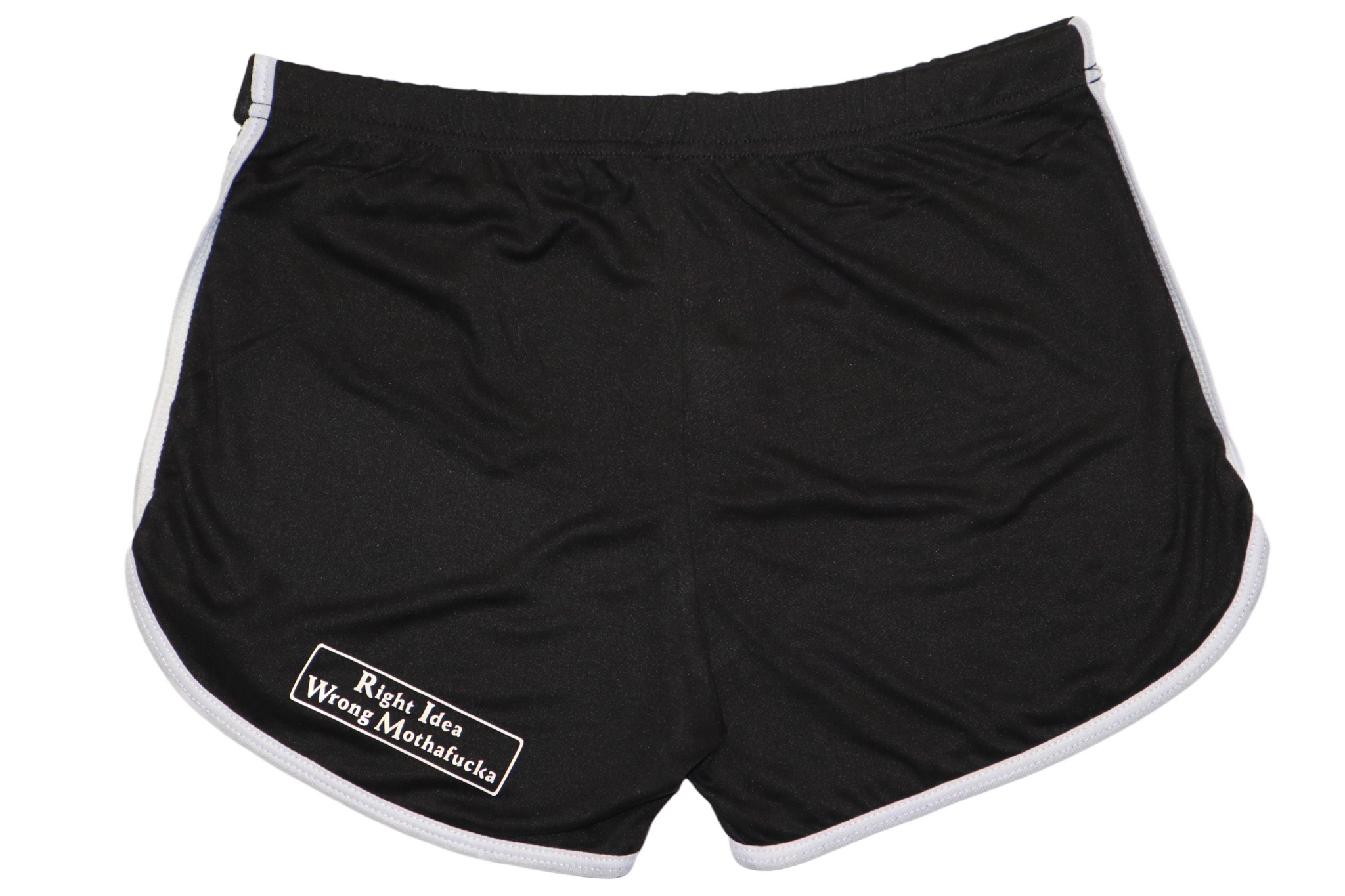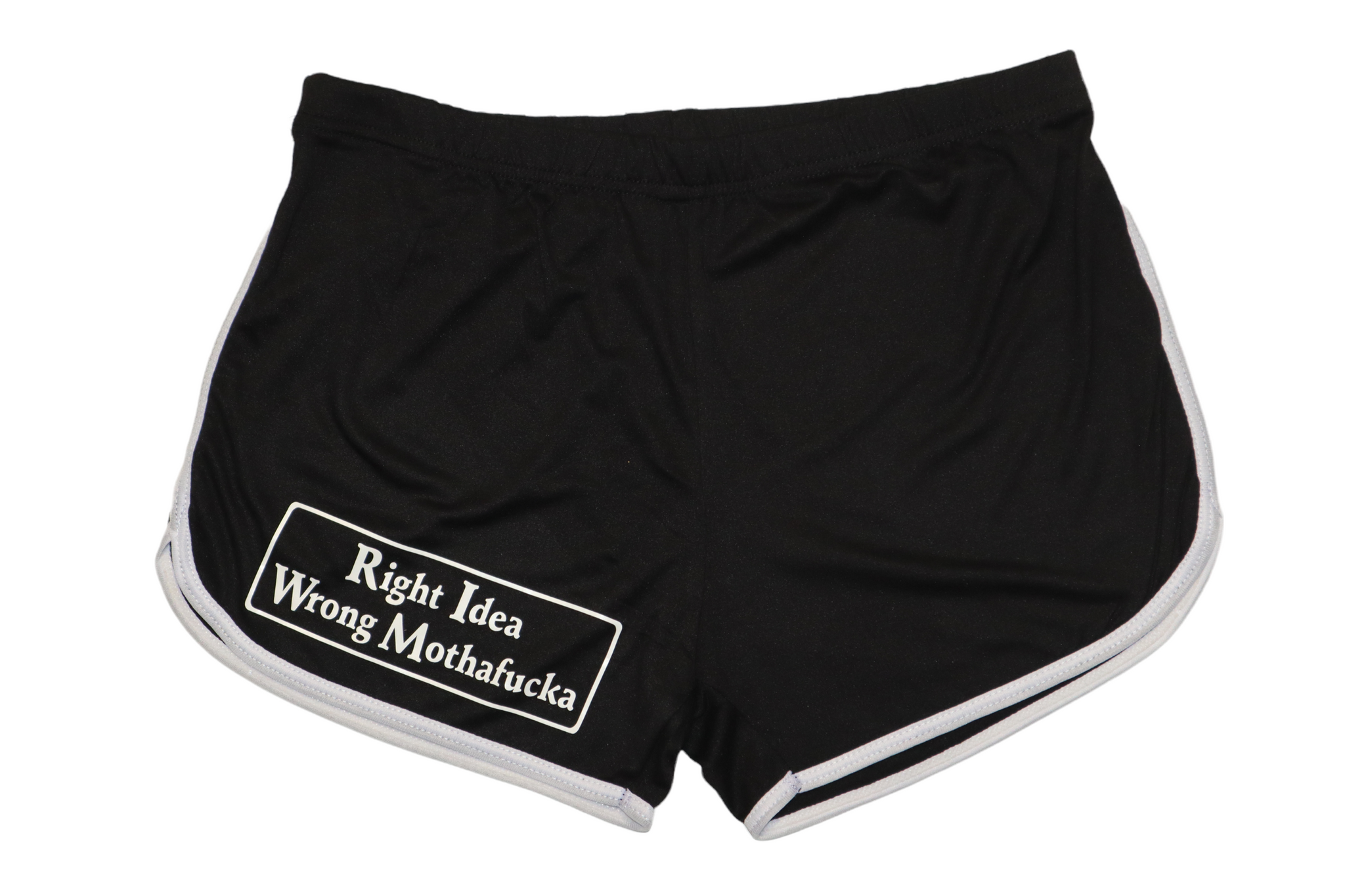Woman’s black shorts with white stripes on both sides and Right Idea Wrong Mothafucka logo in white on front and back.